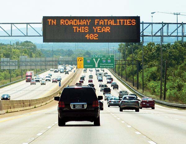 A total of 190 dynamic message signs are located in the state’s four urban areas (Chattanooga, Knoxville Memphis, and Nashville), and in some rural areas across the state. The main purpose of the signs is to alert motorists of incidents, lane blockages, hazardous road conditions, or Amber Alerts. In 2012, TDOT became the first DOT in the nation to display roadway fatality numbers on the overhead signs. In addition to the fatality statistics, safety messages are displayed during off-peak travel times.