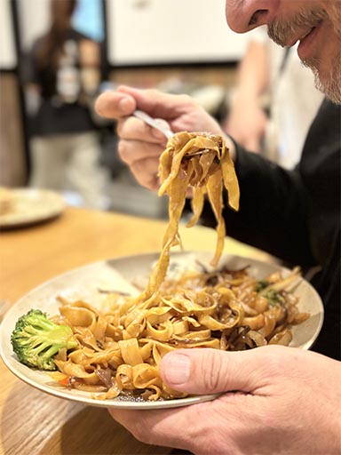 Moments later, she stopped again after overhearing Terri and me debating which of the six noodle thicknesses to pair with her stir-fried shrimp, guiding us to a wall display where replicas of each noodle – ranging from fettuccine-thick to angel-hair thin – were mounted. The care she took in explaining the differences felt like a brief education.