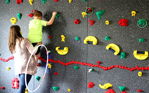 The space incorporates modular walls that allow it to be reconfigured to serve children as they grow into their teens. It also features a climbing wall with hand holds and foot ledges to help children build muscles and encourage movement.