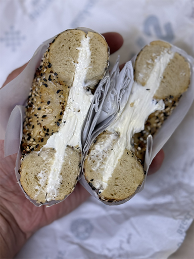 In retrospect, I should have ordered the Nova lox, as its savory flavors are tempting me even now to return, but I’d come to try an Everything with cream cheese – a bagel shop staple – so that’s what I ordered.