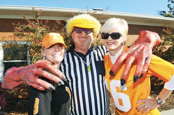 This ghastly ghoul was just one of the many costumed Realtors and sponsors at the Greater Chattanooga Association of Realtor’s Trunk or Treat event on Tuesday. Together with sponsors from Arrow Exterminators, Ascent Home Loans, Bell Development, Boom, First Choice Title, Home Pro Inspection, Jody Millard Pest Control, PEMCO and Peoples Home Equity, these real estate pros from Bridge City Realty pumped lots of little mummies, ninjas and Transformers full of goodies, hosted free games, rides and a bouncy house, and generally made sure the kids who came had a ton of fun. Music, free food and more were also on hand for the festive occasion. Here, Realtor David Freeman gives Bridge City Realty founders Tonjia Landreth (L) and Denise Leach (R) a chilling embrace. (David Laprad)