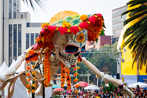 Think of it as a little bit Halloween, a lot of skeletal face-painting, a steady diet of marching band parades and flowery public and private tributes to deceased family and friends. And pets.