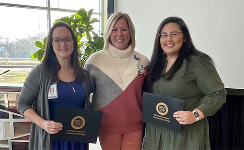 Erlanger Health System recently presented Chattanooga State Community College nursing instructor Heather Akers with the Erlanger Nursing Chair of Excellence for Adults and nursing instructor Lindsey O’Hagan with the Erlanger Nursing Chair of Excellence for Children award.