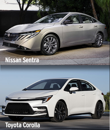The Nissan Sentra starts at $23,845, including the destination fee. The Corolla starts at $24,120 with destination; getting the Corolla Hatchback or Corolla Hybrid will cost approximately $1,500 to $1,900 more.