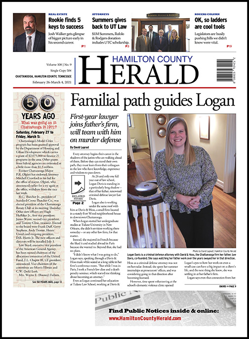 Logan also is working under the same roof with him at Davis & Hoss, a small firm located in a stately Fort Wood neighborhood house in downtown Chattanooga.