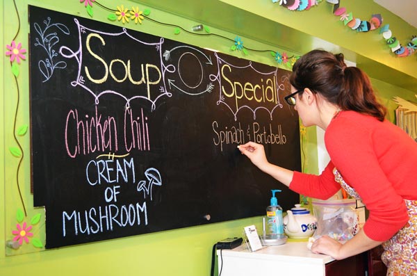 I enjoyed sitting at one of the tables and watching people walk in. Most were clearly expecting nothing more than baked goods, and seemed surprise to learn about the lunch options. Some were puzzled by the limited selections on the chalkboard on which Darras lists her daily specials. It’s not the WHOLE menu. Stop by the cash register to see what else is available.
