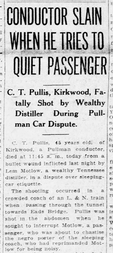 Motlow had boarded an eastbound train heading from St. Louis to Nashville that night. He had been drinking before he boarded the train, although how much he drank was a matter of dispute in his subsequent trial.