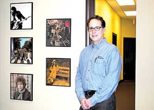 Music lover, Dr. Richard Brackett, stands in front of part of his record collection in his Shallowford office. Brackett says the best act at Bonnaroo last year was Elvis Costello.