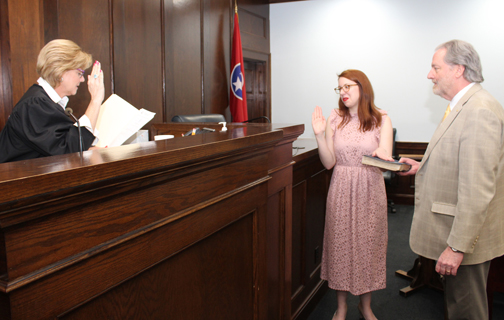 Chancellor Pamela Fleenor inducted attorney Megan Hatcher Hawkins, daughter of local attorney Paul Hatcher, in her courtroom March 25.