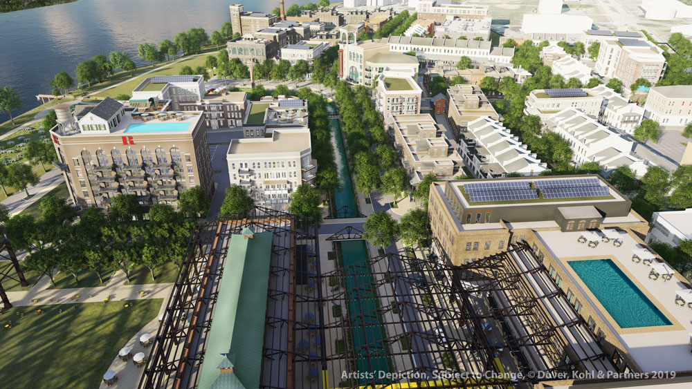 While the vision offers convenience, it’s also packed with charm, Dover adds. “The concept calls for salvaging materials from the old factories and continuing the waterfront revival with the connection to the river.”