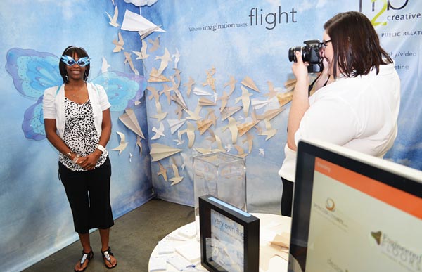 The Chattanooga Chamber of Commerce on March 21 hosted a business expo at the Chattanooga Convention Center. Dozens of businesses displayed products and distributed information and freebies during the daylong event. Above, h2b creative, a local public relations firm with a booth at the expo, dresses up and takes a free photo of a visitor at their booth. (Photo by David Laprad)