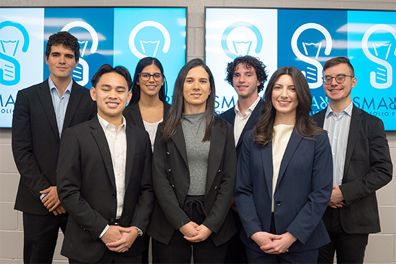 Business professor Joelle Akiki, DBA, who serves as faculty sponsor of the SMARRT Fund team, highlights the hard work and dedication of Amarandei, Glenn Grakov and Alicia Garver, senior finance majors; Kylie Mastrapa and Adrian Helm, junior finance majors; and Eric Barnuevo, senior accounting major.