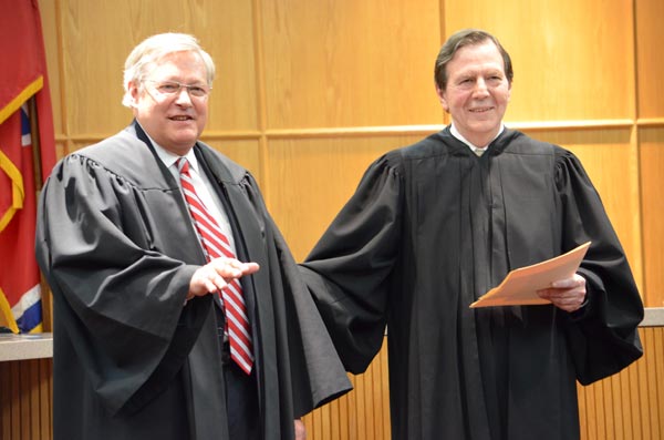 The Honorable Clarence Shattuck swears in David Wilson Norton (left) as General Sessions Court judge. The ceremony took place March 6 at the Hamilton County Court House. Norton grew up in Red Bank, attended law school at Memphis State University, and began his general law practice in Chattanooga in 1977. Hamilton County hired him as an assistant county attorney in 1984. Norton was appointed to the bench as City Judge of Soddy Daisy in 1985, was elected in 1990, and re-elected in 1998 and 2006. (He will be stepping down as he takes on the responsibilities of the new judgeship.) On the state level, the last four governors have appointed him to the Utility Management Review Board. Norton and his wife, Cathy, reside in Middle Valley, where they share five children. They are members of Dallas Bay Baptist Church. Norton replaces the Honorable Robert Moon, Jr., who passed away unexpectedly in January 2012. (Photo by David Laprad)