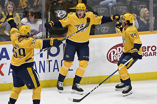 “They’ve been awesome,” Josi says of the McCarron line. “The way they play the game, they’re so hard to play against. It’s hard for the other teams to start against that line because they are coming right at you. They are forechecking. It seems like every game, that first shift, they get a forecheck and get a (scoring) chance out of it. It gives us a ton of energy right away.”