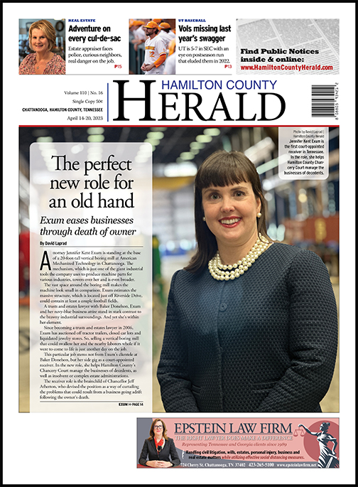 This particular job stems not from Exum’s clientele at Baker Donelson, but her side gig as a court-appointed receiver. In the new role, she helps Hamilton County’s Chancery Court manage the businesses of decedents, as well as insolvent or complex estate administrations.