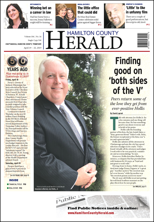 Hollis’ practice extends from Hamilton County to about 20 surrounding counties and he handles cases in both Tennessee and Georgia, giving him a broad reach. Thankfully, he likes his work.