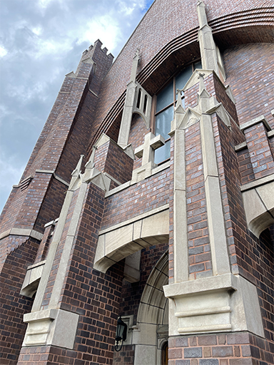 Build around 1906, the brick church is trimmed in stone and features pointed arch windows, buttresses flanking several sides and a large rose window, all of which were important elements of the Gothic Revival style, says the commission.
