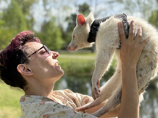 Russo’s mosaic of education ambassadors includes Quasimodo, a deformed box turtle; Mallow, a deaf and nearly blind albino raccoon; Calliope, who’s half captive red mink and half wild mink; and T’Challa, a bobcat who suffered a traumatic brain injury.