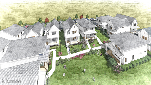 Parking will be relegated to the perimeter of the property, allowing the center of the development to be car-free and walkable. Landscaped walkways will connect the homes, all centered around a large, shared courtyard.