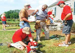 Wearing red t-shirts sporting the words, “Give Where You Live,” more than 120 local agents worked at four residences to help spruce up the outside of the homes. Some of the tasks involved deferred maintenance items such as painting porches, staining decks, repairing fences, installing outside lights, pressure washing, preparing vegetable gardens and planting flowers.
