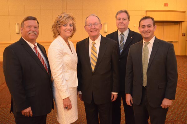 The Honorable Lamar Alexander, United States Senator, was the guest speaker at the Chattanooga Bar Association’s Annual Law Day Celebration May 1 at the Chattanooga Convention Center. Sen. Alexander told the story of his early swearing in as Tennessee’s 45th governor in 1979 at the request of then-U.S. Attorney Hal Hardin to avoid the inappropriate release of inmates by then-incumbent Gov. Ray Blanton. As Law Day honors the place of law in society, Sen. Alexander tied his speech into brief comments about the rule of law in action. From L-R: Hamilton County Mayor Jim Coppinger; Lynda Hood, executive director of the Chattanooga Bar Association; Sen. Alexander; attorney Paul Hatcher, treasurer, CBA; and attorney Craig Smith, president, CBA. (David Laprad)