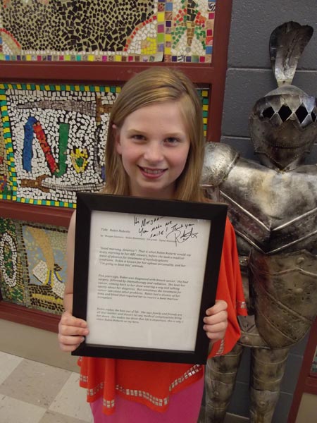 In December 2012, the Nolan Elementary PTA held a Citizenship Essay Contest. The theme was “My American Hero.” One of the school›s 5th grade students, 11-year-old Morgan Sizemore, wrote about ABC Good Morning America Anchor Robin Roberts and her battle with cancer. Morgan’s essay won 3rd place in the Nolan PTA contest and 3rd place in the Hamilton County PTA contest. Local ABC affiliate WTVC News Channel 9 and their reporter Drew Bollea did a story on Morgan and her essay about Roberts. Julie Baumgardner, executive director of First Things First, saw the story and sent it to ABC, who delivered it to Roberts. Roberts wrote Morgan a note on her essay, signed it, and sent it back to Baumgardner, who presented it to Morgan during 5th grade graduation. (Photo provided)