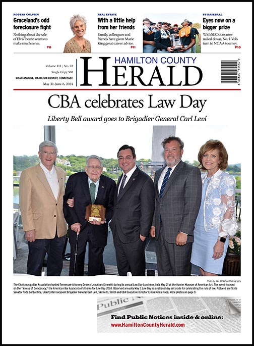 The Chattanooga Bar Association hosted Tennessee Attorney General Jonathan Skrmetti during its annual Law Day Luncheon, held May 21 at the Hunter Museum of American Art. The event focused on the “Voices of Democracy,” the American Bar Association’s theme for Law Day 2024. Observed annually May 1, Law Day is a national day set aside for celebrating the rule of law. Pictured are State Senator Todd Gardenhire, Liberty Bell recipient Brigadier General Carl Levi, Skrmetti, Smith and CBA Executive Director Lynda Minks Hood. More photos on page 9.