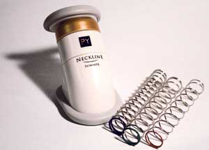 The Paul Younane Neckline Slimmer is a progressive resistance toner for the neck, jaw and chin muscles. It comes with three Power Coils in pink for low resistance, green for medium resistance and purple for high resistance.