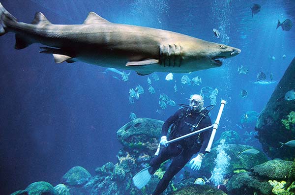 One hundred and eighty five divers currently volunteer their services at the Aquarium. Barring Thanksgiving and Christmas, at least a few of them are in the water every day, cleaning and maintaining the exhibits, feeding the animals, and doing live education programs for the Aquarium’s visitors. Mark Craven, dive safety officer, says these volunteers are vital to the Aquarium’s operation.