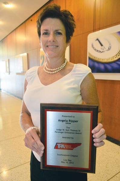 Gail Elsea had to let the cat out of the bag early. She had nominated her boss, Unum Group employment attorney Angela Ripper, for the Judge W. Neil Thomas III Paralegal Utilization Award, and Ripper had won. But there was a problem: The Southeast chapter of the Tennessee Paralegal Association, which gives out the award, was scheduled to announce Ripper as this year’s recipient during the Chattanooga Bar Association’s Law Day celebration, and Ripper spends her lunch hour working out in the company gym.
