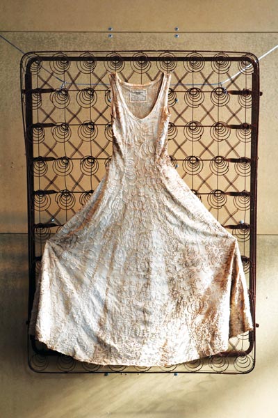 Chanin’s hand-sewn dresses were pit-smoked at Jim ‘N Nicks Bar-B-Q for the 15th annual Southern Foodways Alliance Symposium in Oxford, Miss., titled, Barbecue: An Exploration of Pitmasters, Places, Smoke and Sauce. Soon to be on display at Warehouse Row until late August, the dresses have yet to be exhibited anywhere other than the symposium.