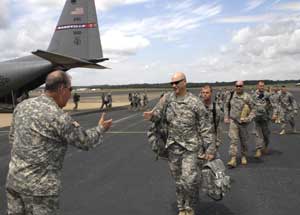 Tennessee National Guard Chief of Staff Col. Terry Ethridge has a big welcome-home handshake for National Guard soldiers from Kingsport and Newport who arrived July 20 at the Guard Flight Facility in Smyrna.