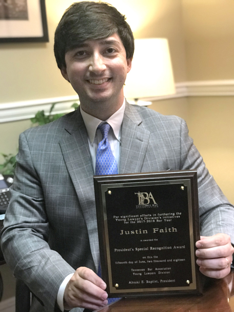 Faith was also selected as the 2018 recipient of the President’s Special Recognition Award for his significant efforts furthering the initiatives of the TBA’s Young Lawyers Division this past year, including expanding the YLD’s social media presence, preparing the YLD’s monthly attorney spotlight features and promoting the group’s clinics and events.