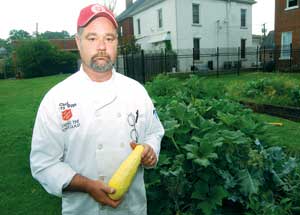 Chef Terry Epps is the food service manager at the Chattanooga branch of the Salvation Army. He runs the Salvation Army School of Culinary Arts, which teaches homeless people basic culinary skills and then helps them to find a job in their new field. Here, he shows off a vegetable he just plucked from the garden located outside his kitchen. Epps serves between 7,000 and 9,000 meals a month, and he says the organic, pesticide-free food his students grow in the garden, which Ace Hardware donated, reduces his produce cost by 25 percent.
