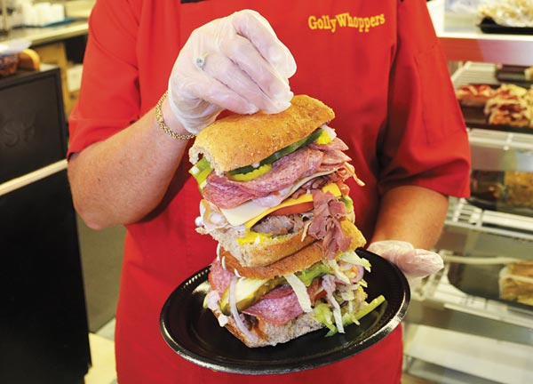 As my GollyWhopper sat in front of me, reaching nearly from the table to my neck, I realized I was in no ordinary deli. The size of the sandwich did not make it special, but the engineering that went into it did. When it comes to building a hoagie at home, I’m a Cro-Magnon. I open my refrigerator and start slapping stuff on the bread without giving any thought to how I’m assembling it. But the crew at GollyWhoppers is made up of sandwich scientists.