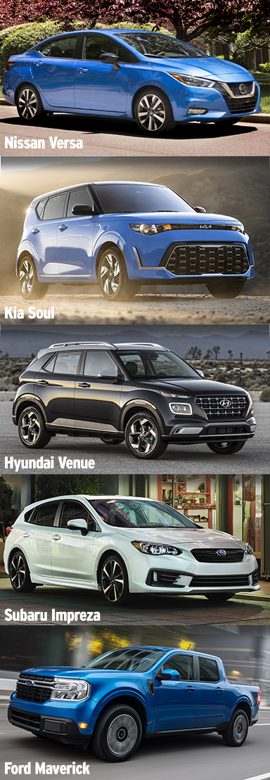 Note that these inexpensive prices are for the base models, which might not be carried by dealerships in the current market. You might need to plan ahead and order the vehicle if need be.