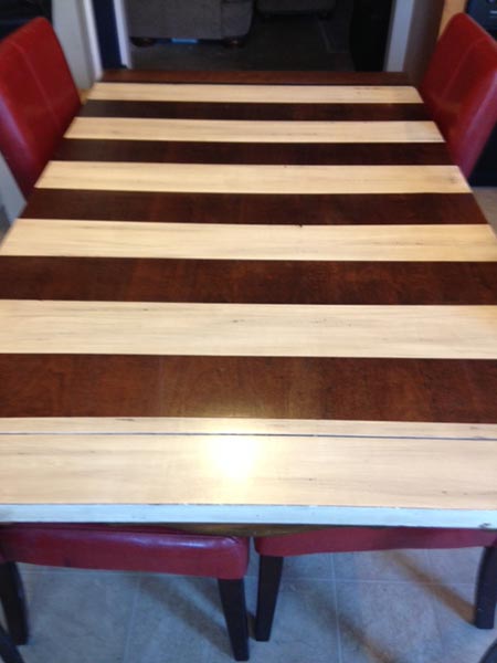 Depending on how you have decided to refinish your table, you can now start staining, or painting the design. If you have chosen to use a solid stain, make sure to stain in the same direction of the wood grain. After you have finished the first coat of stain, make sure to wipe off any excess. Stain does not need to sit and penetrate. You always want to wipe off the excess and allow at least a 24-hour drying period in between each coat. Usually applying a minimum of three coats of stain will ensure a fabulous finish.