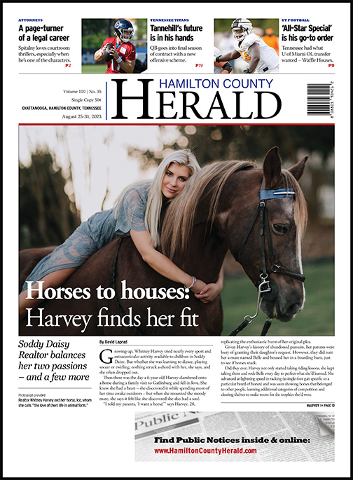 Harvey’s first love, however, continues to be her horses, which spend their days grazing a sun-kissed field between her parent’s house and the residence she built for herself on her family’s Soddy Daisy property. Among them are Ice, whom Harvey calls “the love of (her) life in animal form,” and Finn, a rescue who ambled onto her property one day as a bag of skin and bones and is now “as fat and sassy as horses come,” Harvey laughs.