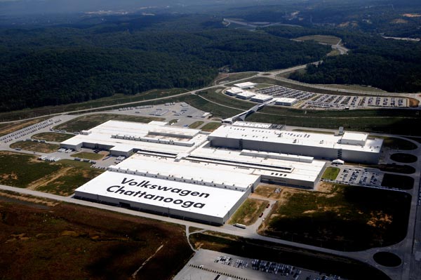 Volkswagen Chattanooga’s 650-foot-long roof sign and 33-acre solar park are now visible on Google Maps. The sign, on the roof of the body shop, is 633 feet long and 208 feet deep. The capital letters are 85 feet high and the lower-case letters are 55 feet high. The roofing signage is an acrylic, elastomeric, spray-applied coating. The sign was completed in September 2012. The solar park, which is the largest in the state of Tennessee, contains 33,600 solar modules and produces 12.5 percent of the plant’s energy needs during production. The solar panels were “turned on” in January of this year. To see the sign and the solar park, go to maps.google.com and type in “8001 Volkswagen Drive, Chattanooga, Tenn.” (Photo provided)