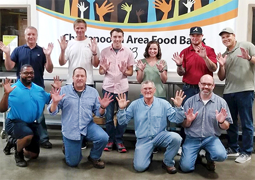 BASF employees this month packaged donations at the Chattanooga Food Bank that provided 621 meals to families. Volunteering at the food bank is one way BASF employees support their neighbors. Top row (from left): Bill Thomas, Bert Templeton, Zachary Miller, Alexis Weaver, Derek Bramlett and Tyler Chamblin. Bottom row: Chattanooga Food Bank Employee Rodney McCullough, Rob Gagliano, Jack Jones and Andrew Cates.