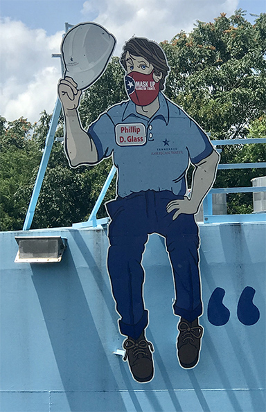 Tennessee American Water’s Phillip D. Glass, the icon that sits atop the company’s landmark water storage tank on Amnicola Highway, has masked up in support of the Hamilton County Department of Health directive to wear masks or face coverings in public settings to help slow the spread of COVID-19 in the community. In addition to wearing a mask or face covering over the nose and mouth in public areas, other recommendations to slow the spread of coronavirus include frequent hand-washing and social distancing of 6 feet.