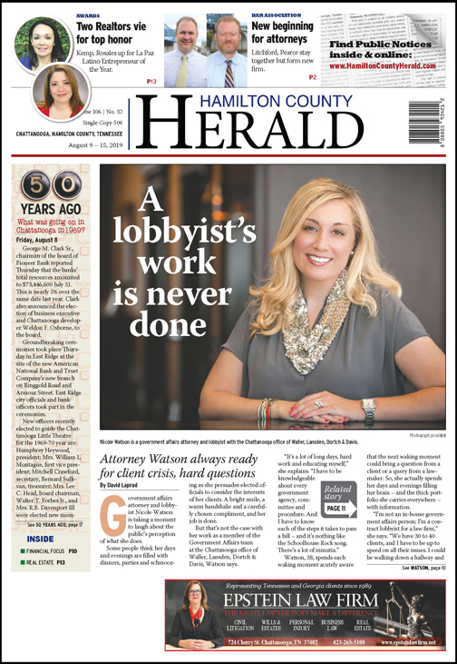 Watson’s current efforts in Chattanooga include working with the city council to bring products by scooter maker Lime to the city and representing Hospice of Chattanooga and Cempa Community Care. While working with Cempa, she was part of a successful attempt to advocate for state legislation that allows nonprofits to operate needle exchange programs.