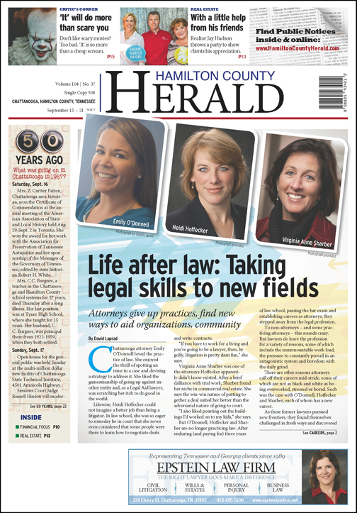 So, unsure about where her law degree was going to take her, Hoffecker slipped her resume into all the slots at the job fair and did the customary round of interviews. Robinson Smith & Wells in Chattanooga bit.