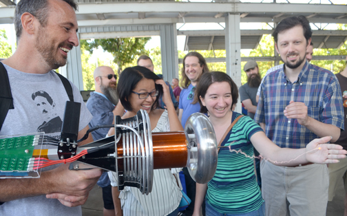 A computer programmer by trade, Prince says this is the third version of the gun, and the first one that worked. “We blew up a couple while we were trying to perfect it,” he says as he fires a bolt of lightning at a boy’s hand.