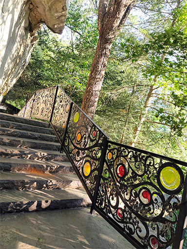 “Chris Mosey of Ignis Glass Studio produced the glass rondels for the railings and doorways and Michael Brandt of Garage Bound plasma cut the decorative railing panels from our digital design files,” Jackson says. “Terry Lohmann and his crew of stone masons built the walkways, overpasses, water features and walls.”