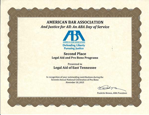 Legal Aid of East Tennessee (LAET) has won the second place award for Legal Aid and Pro Bono Programs in the American Bar Association’s 7th Annual National Celebration of Pro Bono competition. The competition seeks to recognize legal aid programs from across the country for their exemplary work during National Pro Bono Month in October.