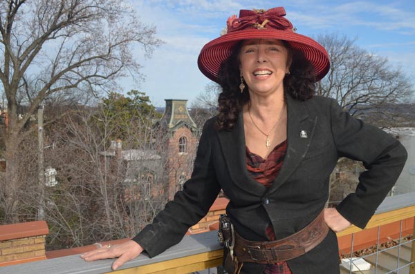 O’Dwyer certainly isn’t dressed like a lawyer. Her long, dark locks fall over the shoulders of a black swallowtail coat, which she’s buttoned over an ordinary red plaid dress. Fixed to her lapel is a black and silver pin bearing the words “Illinois Central.” A hand-tooled leather gun holster is wrapped around her waist, providing a snug confine for her cell phone. Inspired by a bareback rider she met, she wears it everywhere she goes – including court.