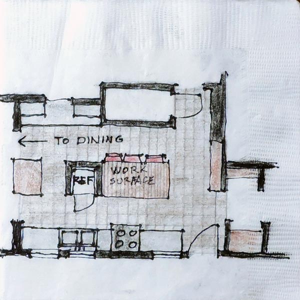 The single family residential kitchen is a key focal point in homes today. Decades earlier in the design of his Usonian homes, architect Frank Lloyd Wright called the kitchen the workspace. Today, it’s a diverse space with the ability to multi-task, even becoming a part of the living space as part of the overall room. Functional layout is important, and with careful planning, it’s easy to serve multiple tasks. The following sketch done for a renovation is just such an exercise.