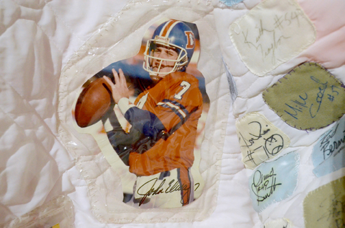 The lining of a bright orange jacket sporting the Denver Broncos logo contains an autographed photo of John Elway. A Pittsburg Steelers jacket sports a picture and autograph of Terry Bradshaw.