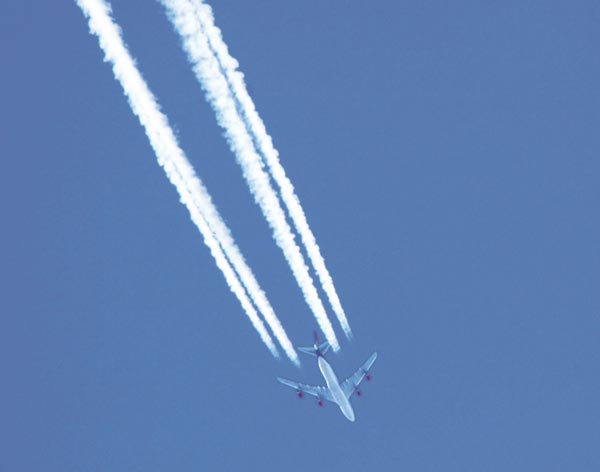 While air travel today accounts for just three percent of worldwide greenhouse gas emissions, the carbon dioxide and other pollutants that come out of jet exhaust contribute disproportionately to increasing surface temperatures below because the warming effect is amplified in the upper atmosphere.